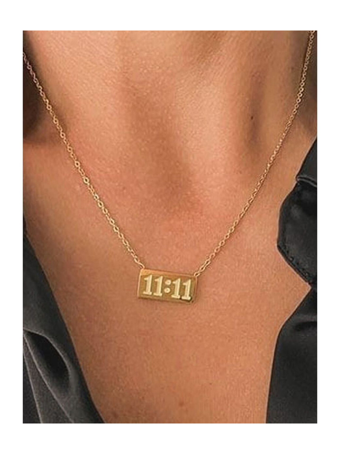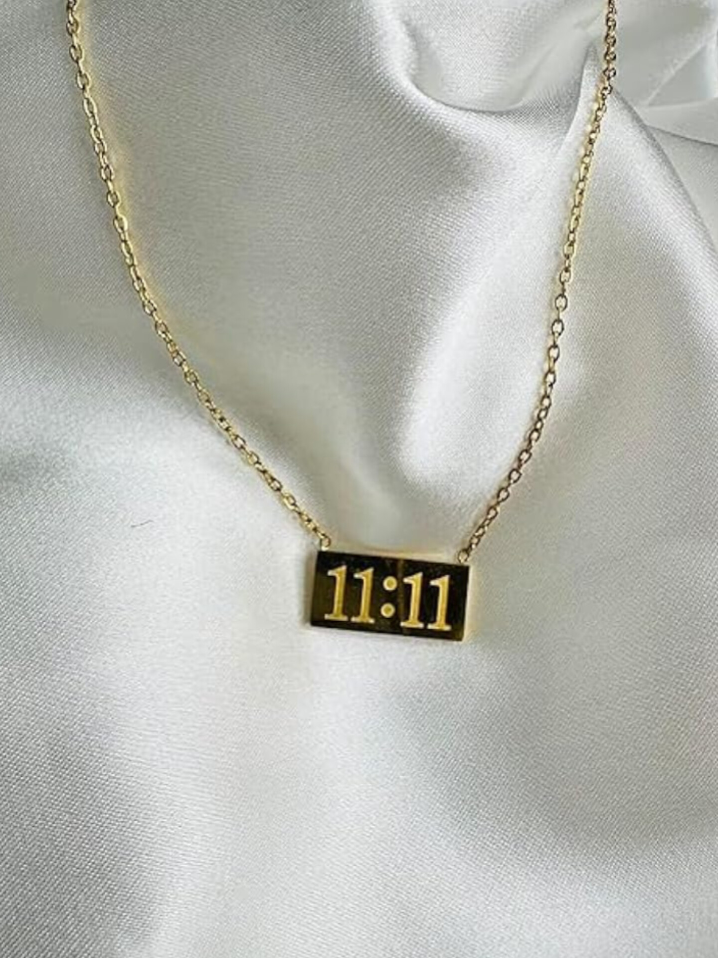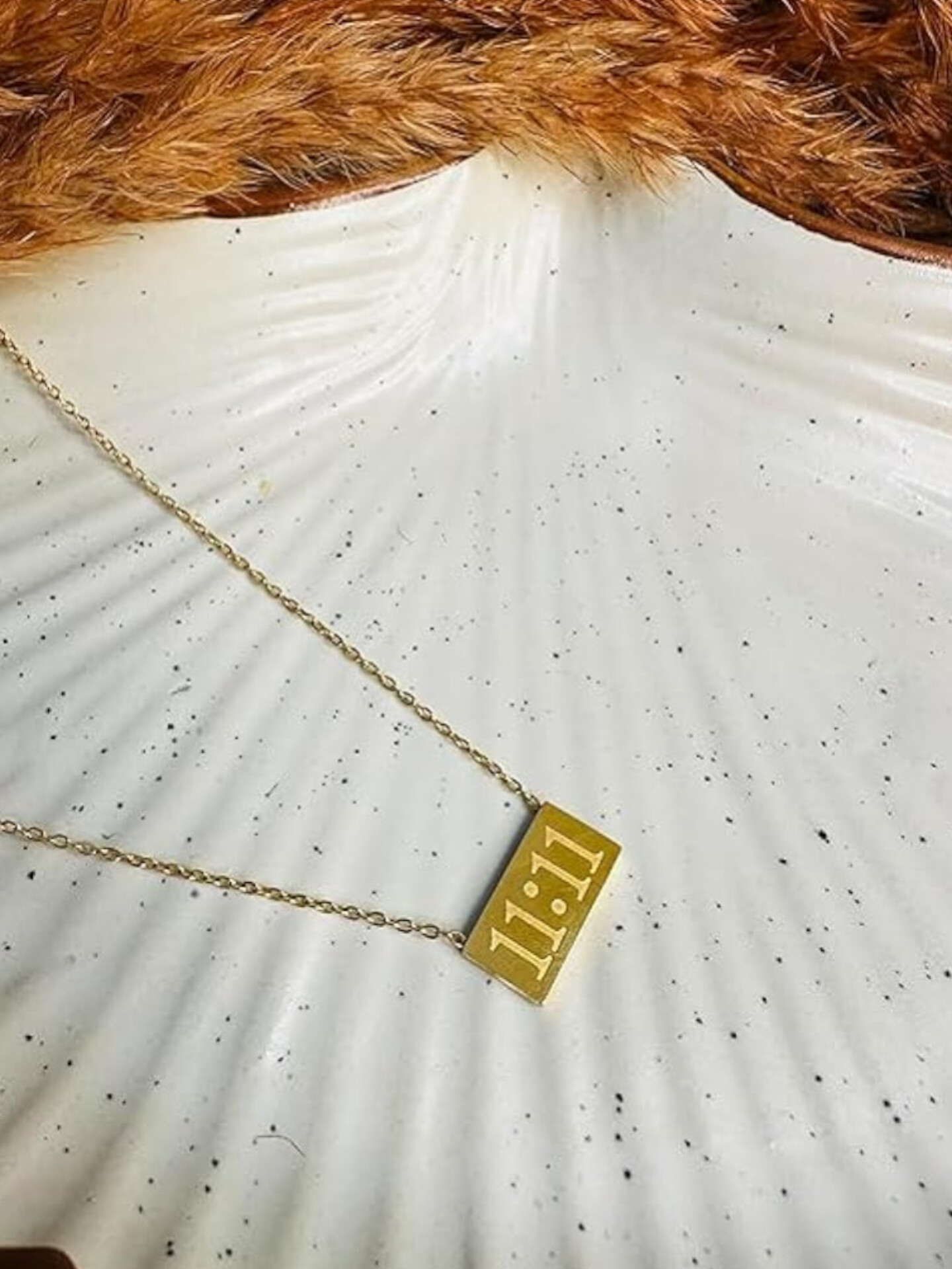 - A chic gold-tone necklace featuring a sleek rectangular pendant engraved with “11:11,” a symbol of alignment and manifesting your desires.