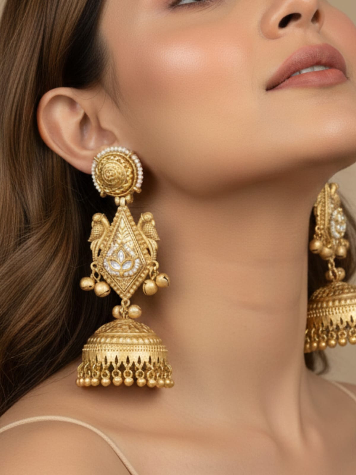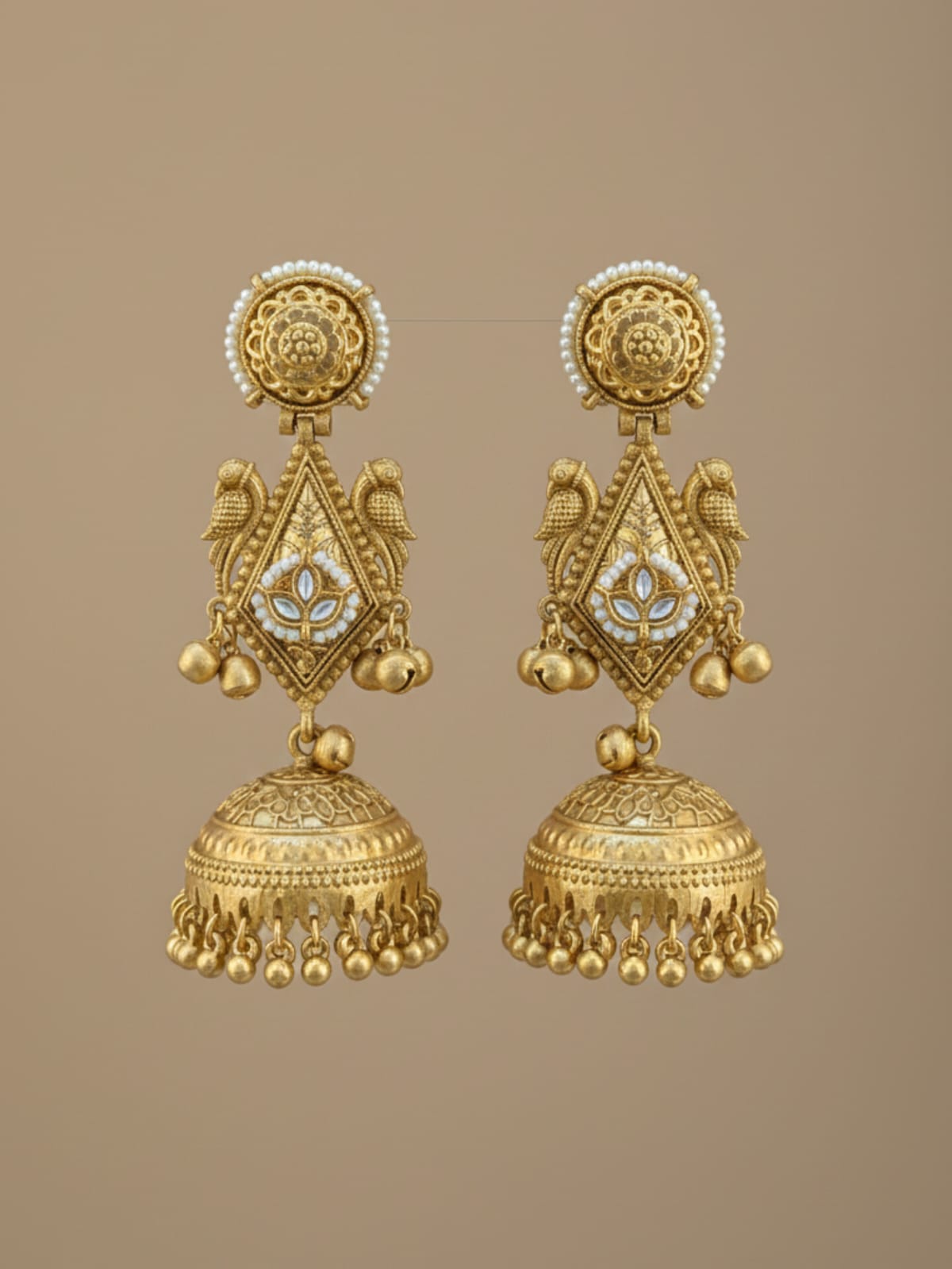 - They feature a stylized peacock or bird motif stud from which the voluminous, dome-shaped jhumka bell gracefully suspends.