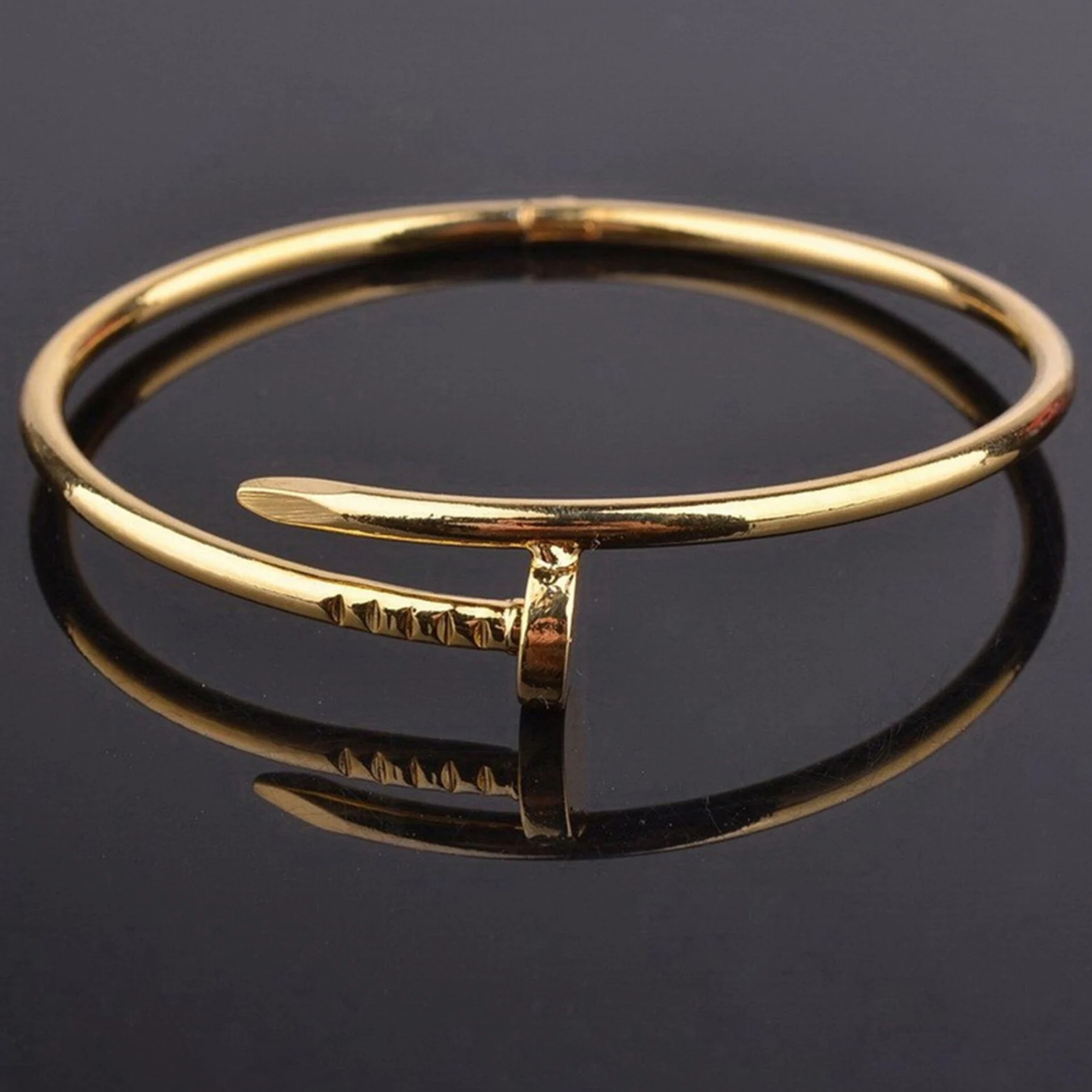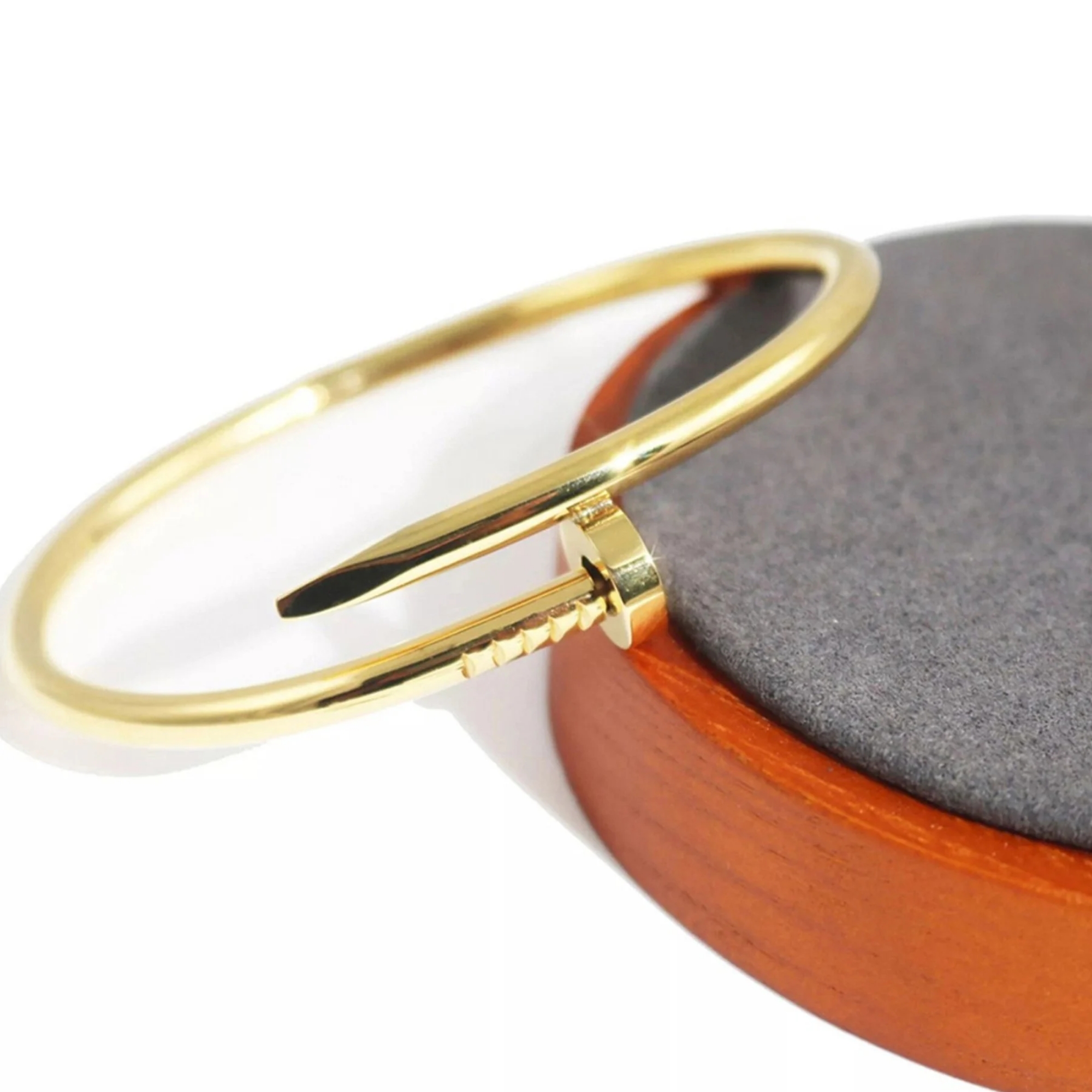 Bold, gold-toned cuff reimagines everyday high-fashion statement, featuring a sleek nail silhouette that wraps effortlessly around the wrist.