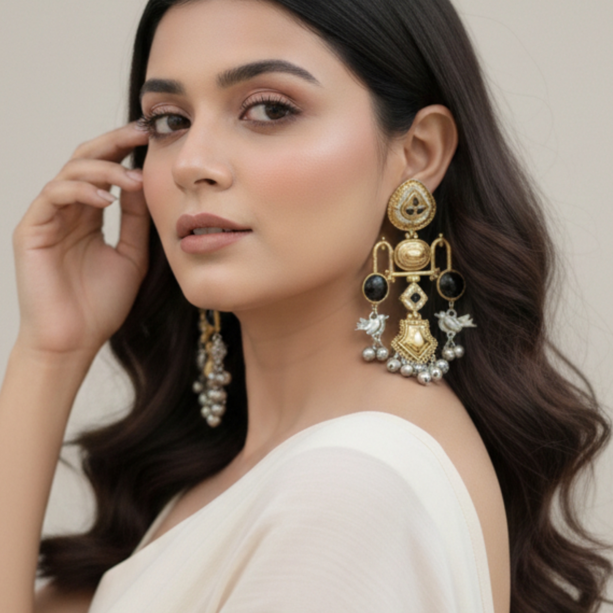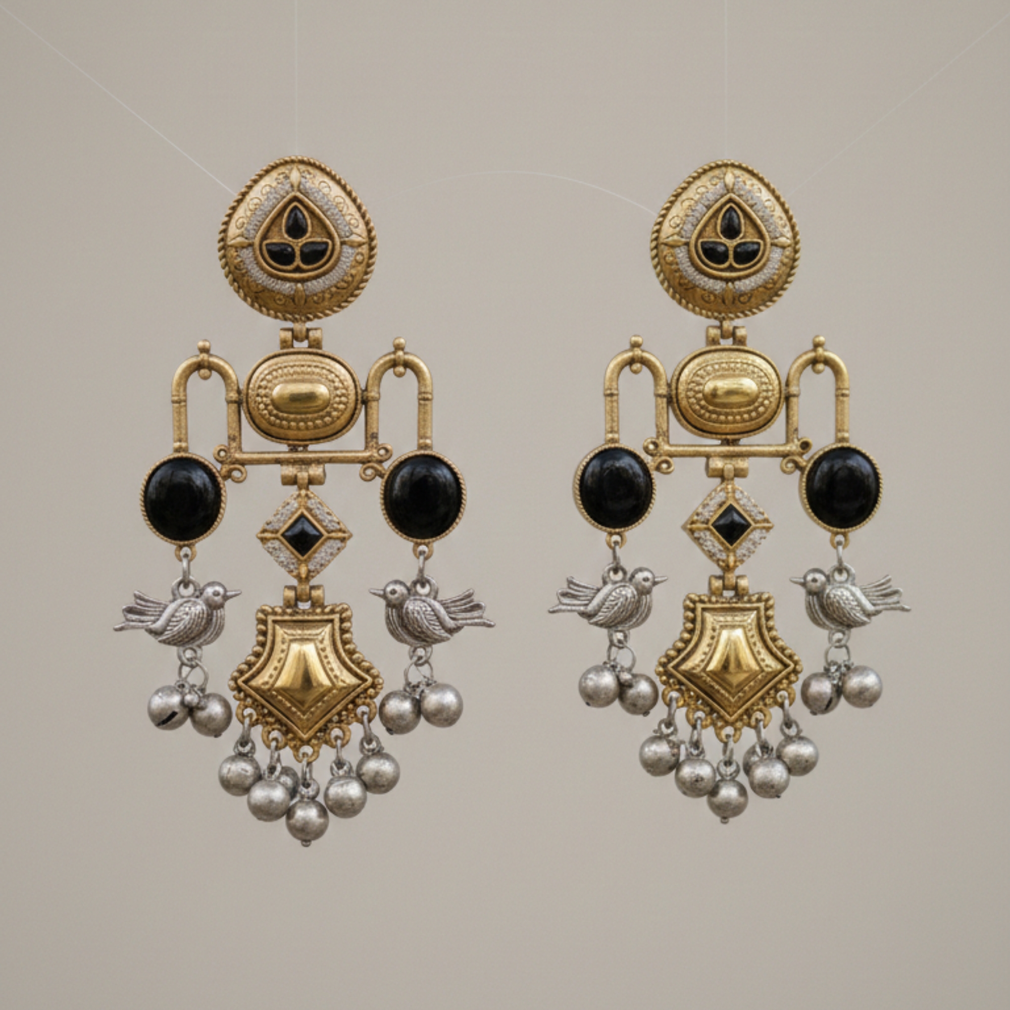 Exquisitely crafted with a striking dual-tone finish, these statement earrings feature intricate silver bird motifs set against a detailed gold-toned frame.