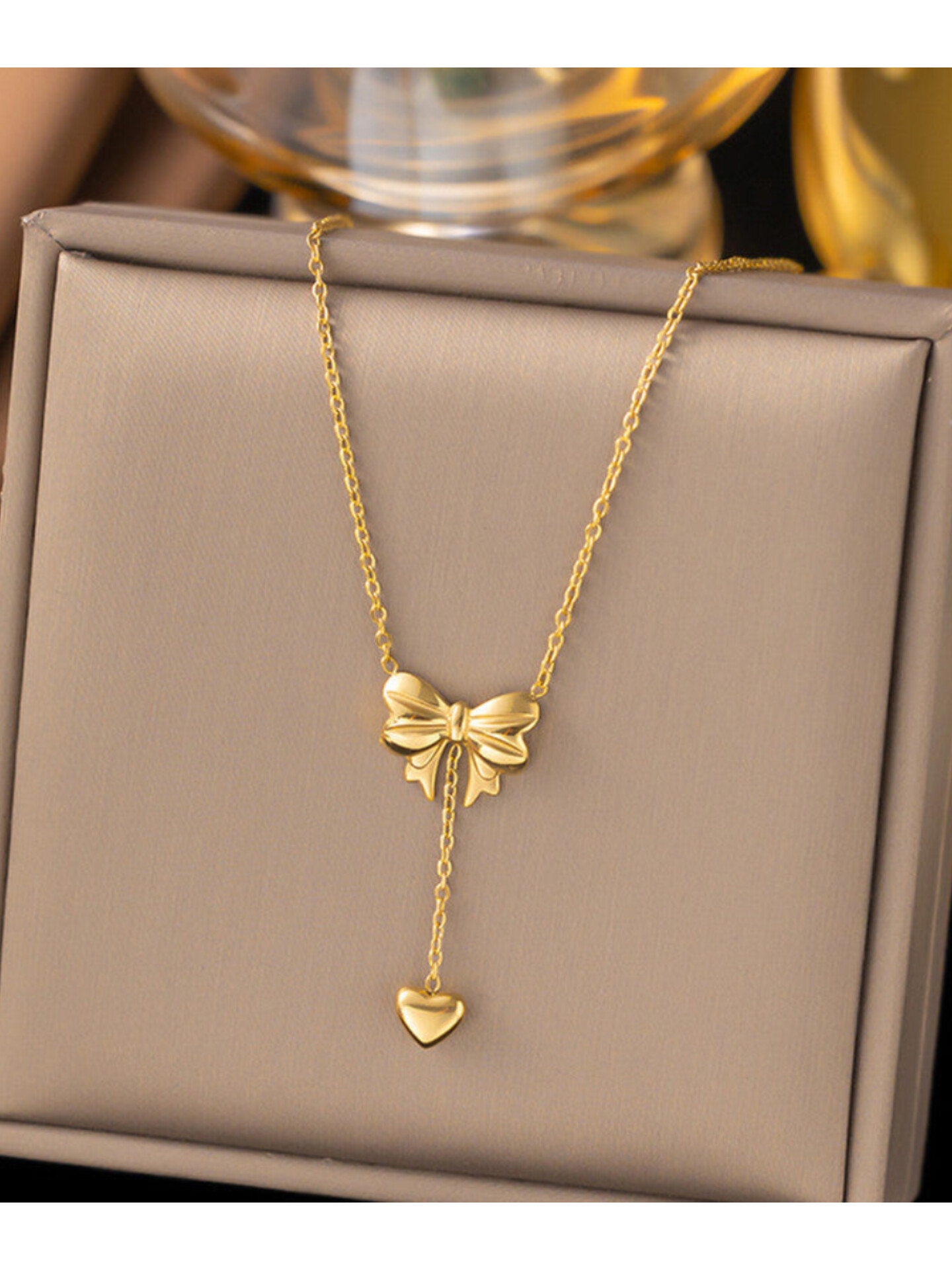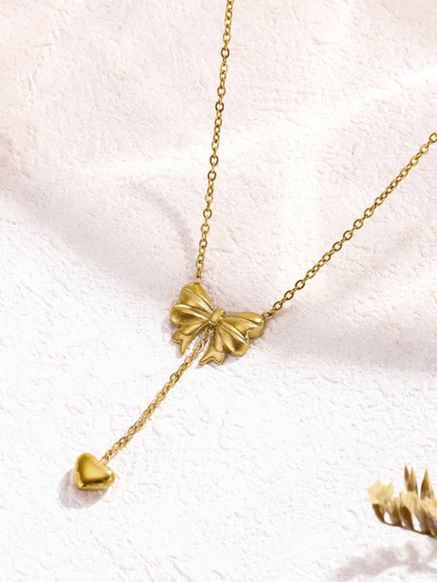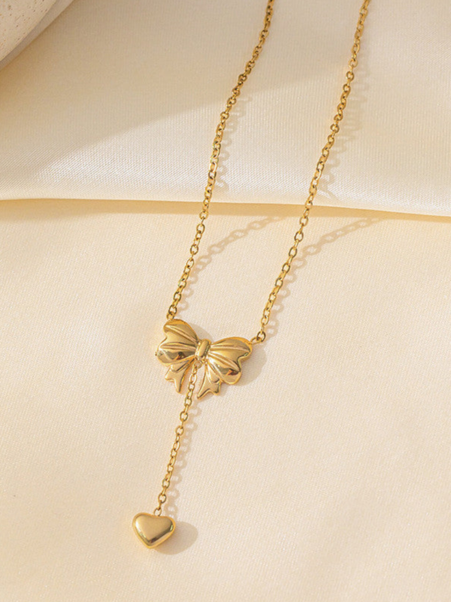 - A charming gold-tone necklace featuring a delicate bow centerpiece paired with a dainty heart drop pendant.