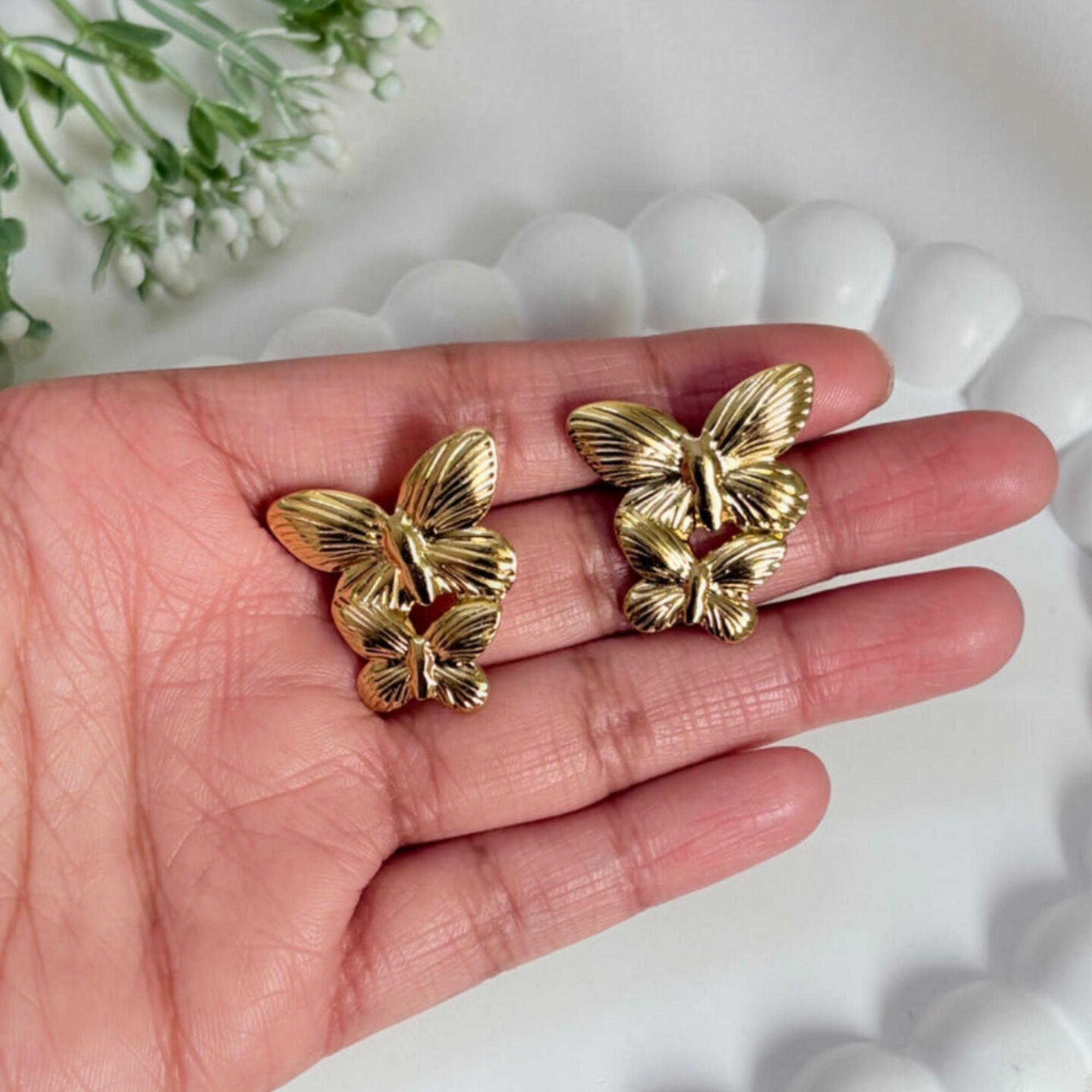 Each earring features a delicate design with two butterflies, one larger & one smaller, creating a beautiful layered & asymmetrical look.
