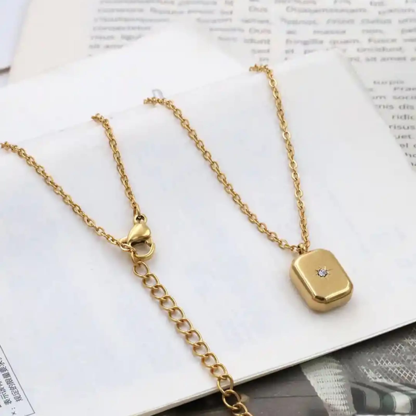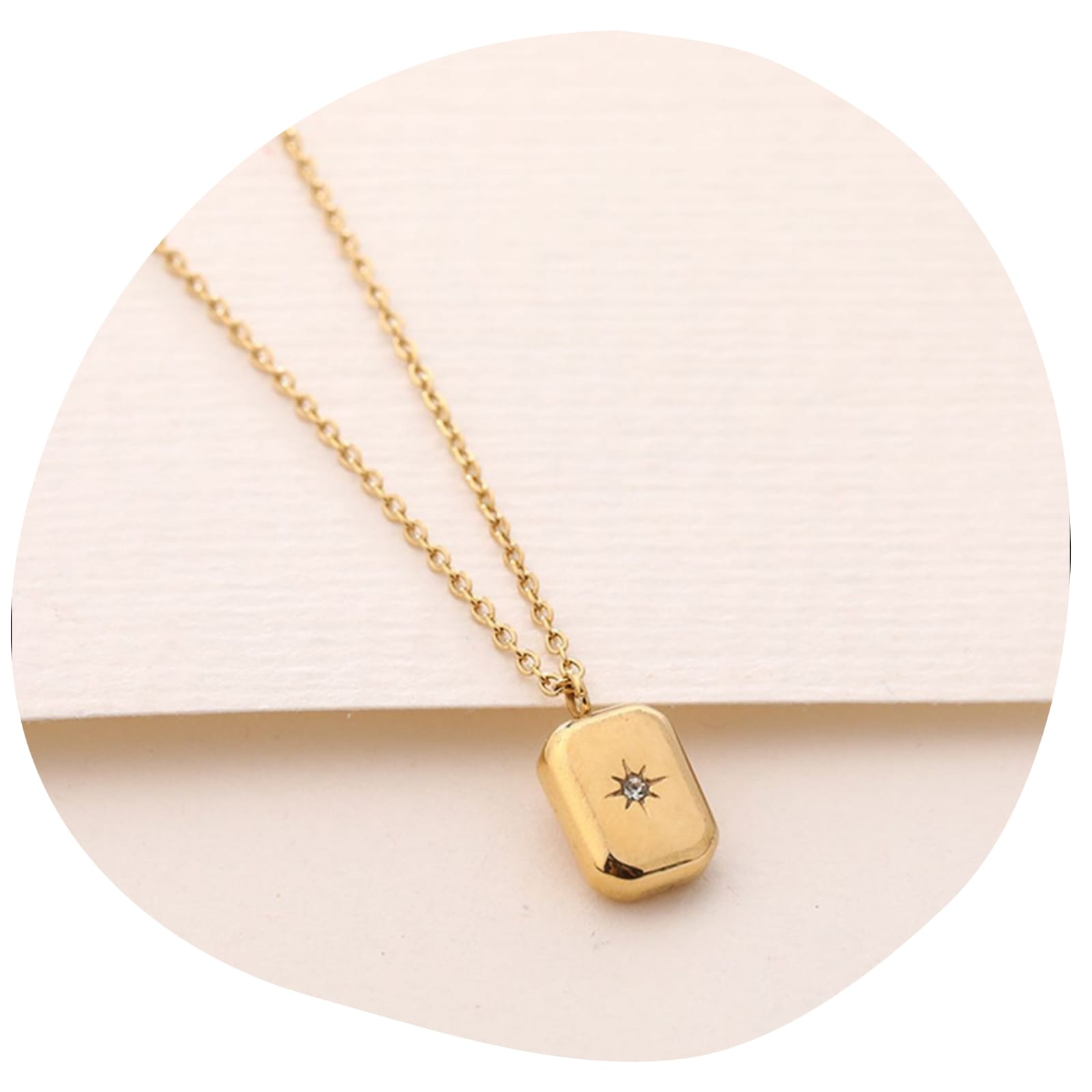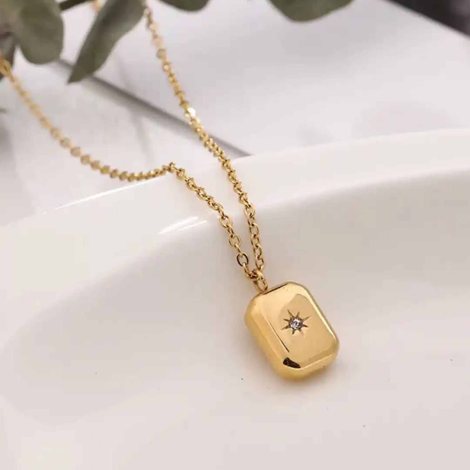 A sleek gold-tone pendant featuring a radiant starburst detail with a shimmering center stone.