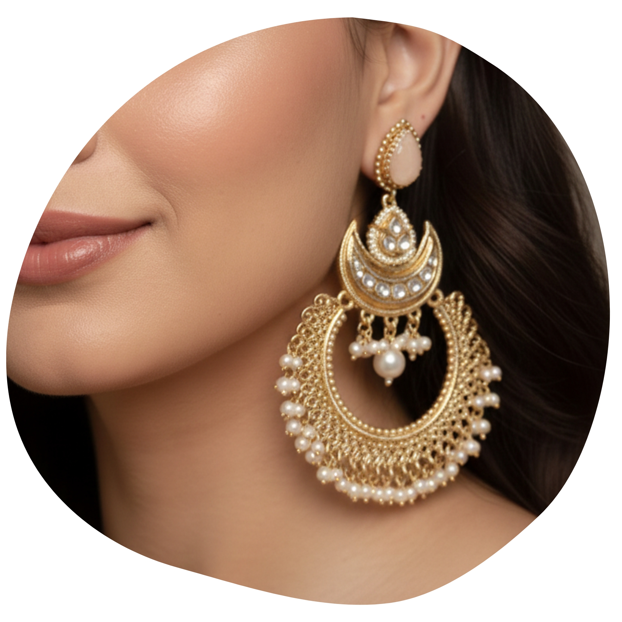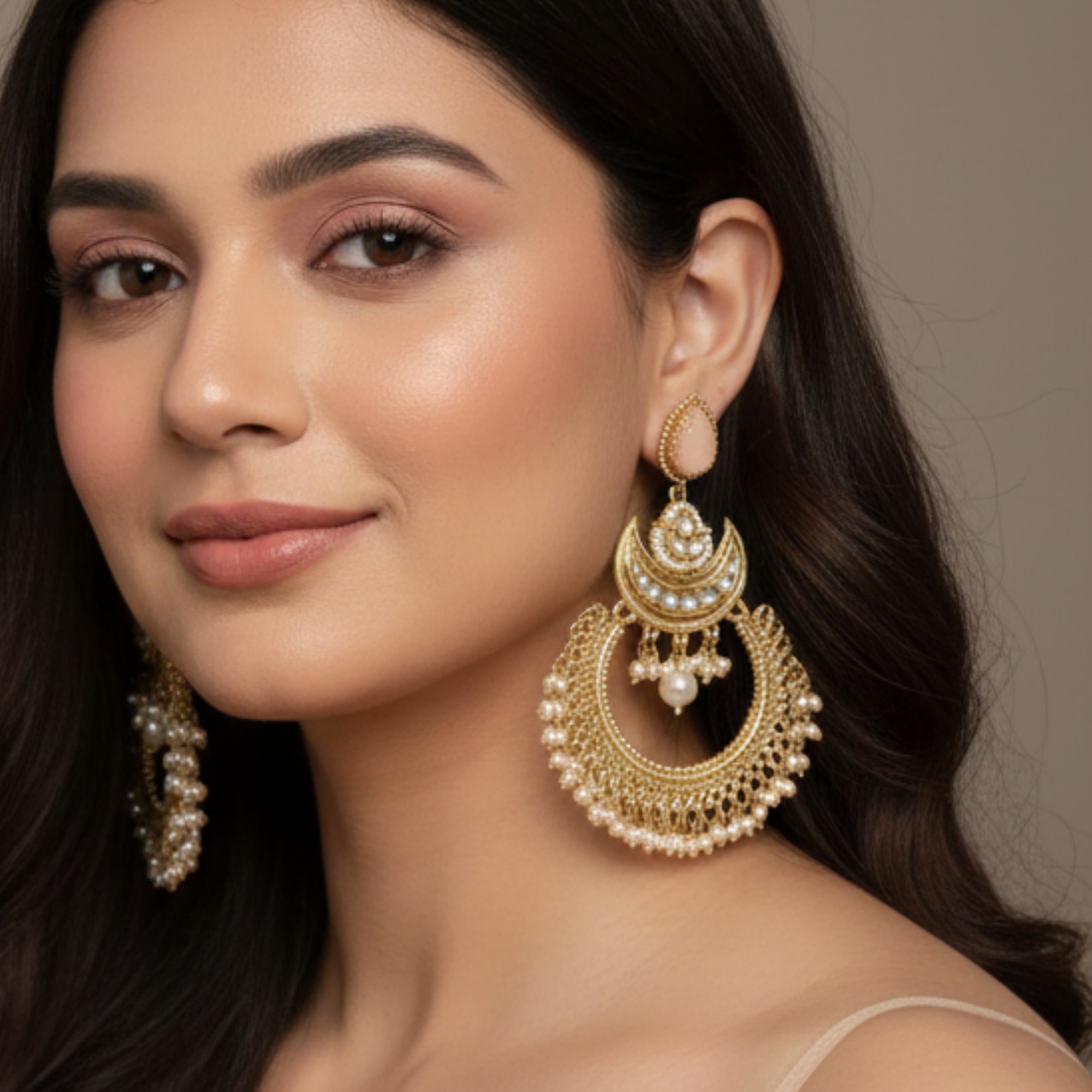 These stunning earrings are a contemporary take on the classic Indian Chandbali design, featuring an intricate, oversized crescent moon motif.