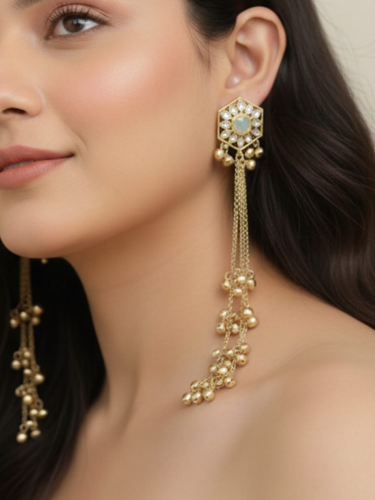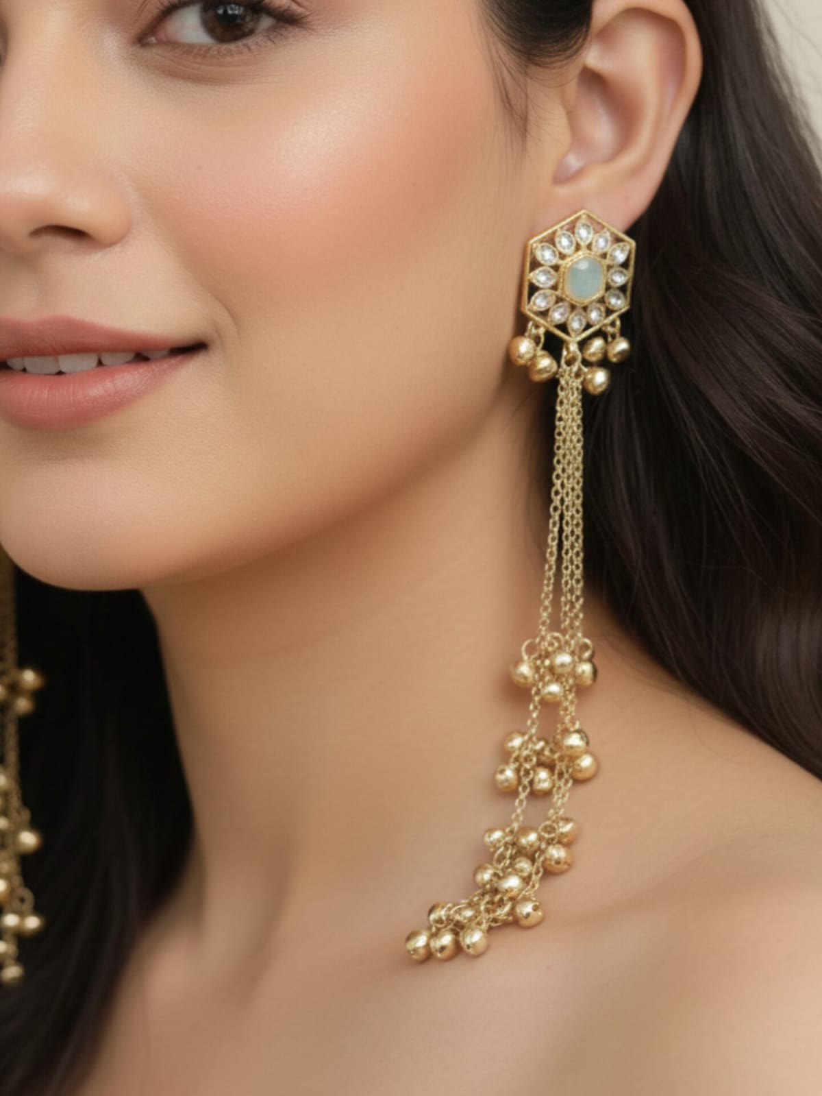 - Elegant chains descend gracefully from the stud, leading to shimmering clusters of small, bell-shaped metallic (jhumki-style) elements.