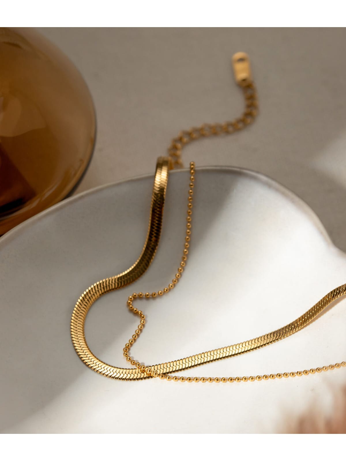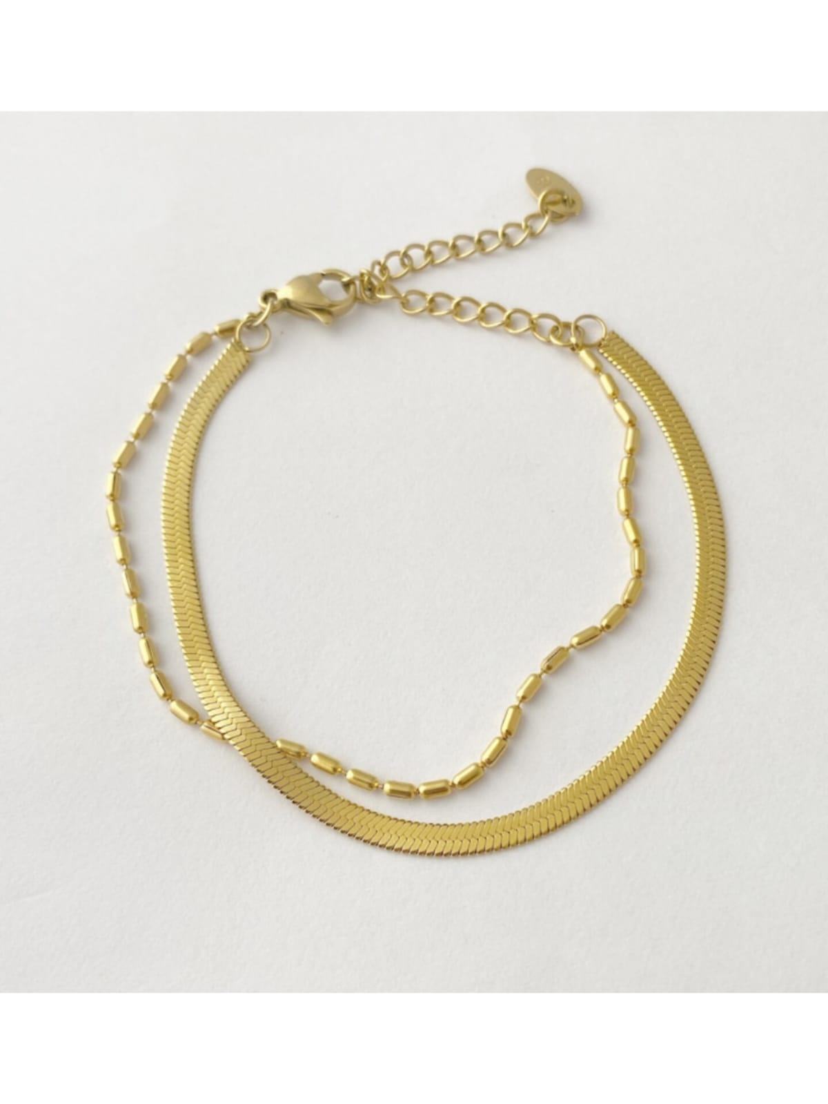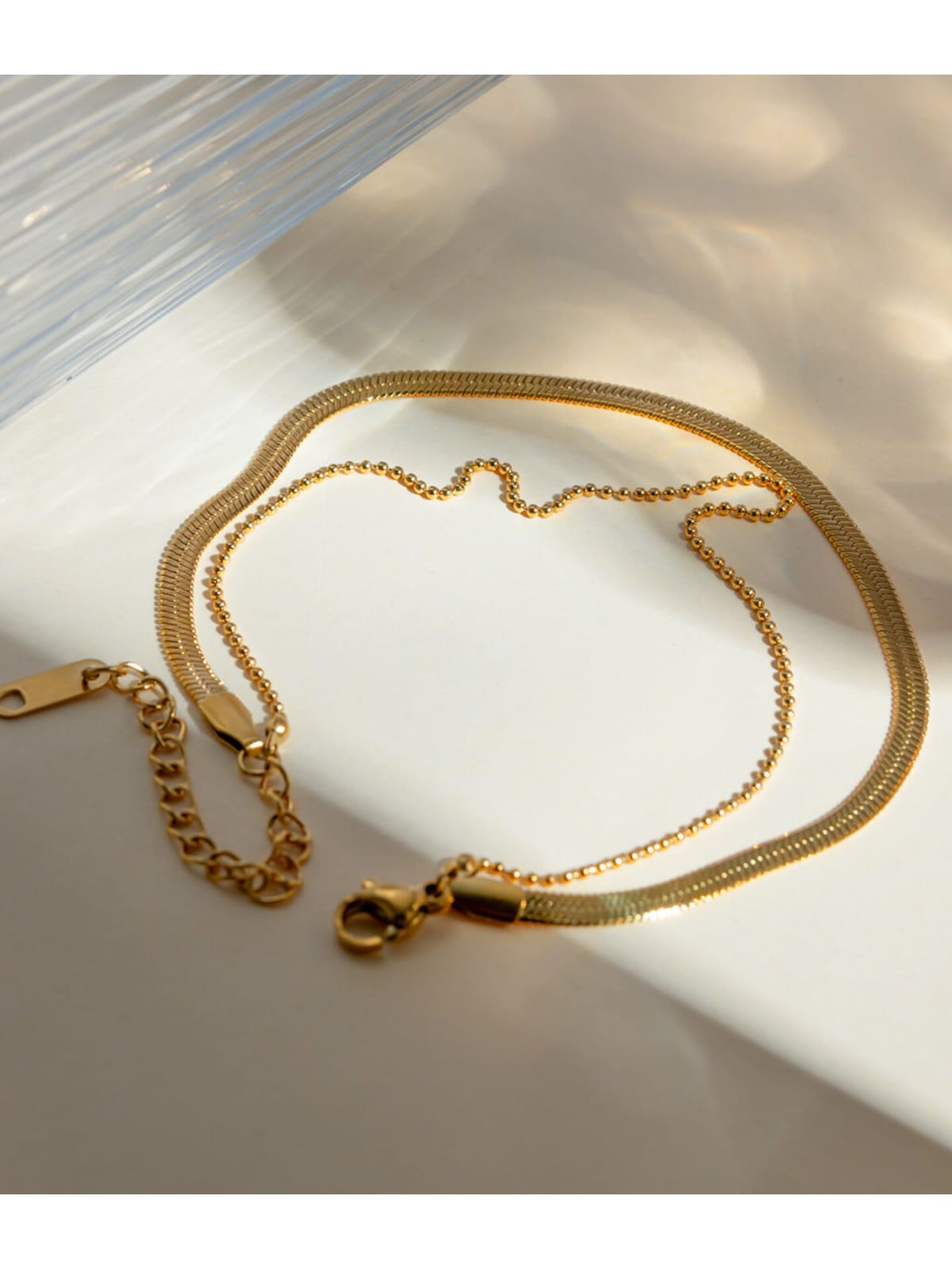 - A chic layered anklet combining a sleek flat chain with a delicate beaded strand.