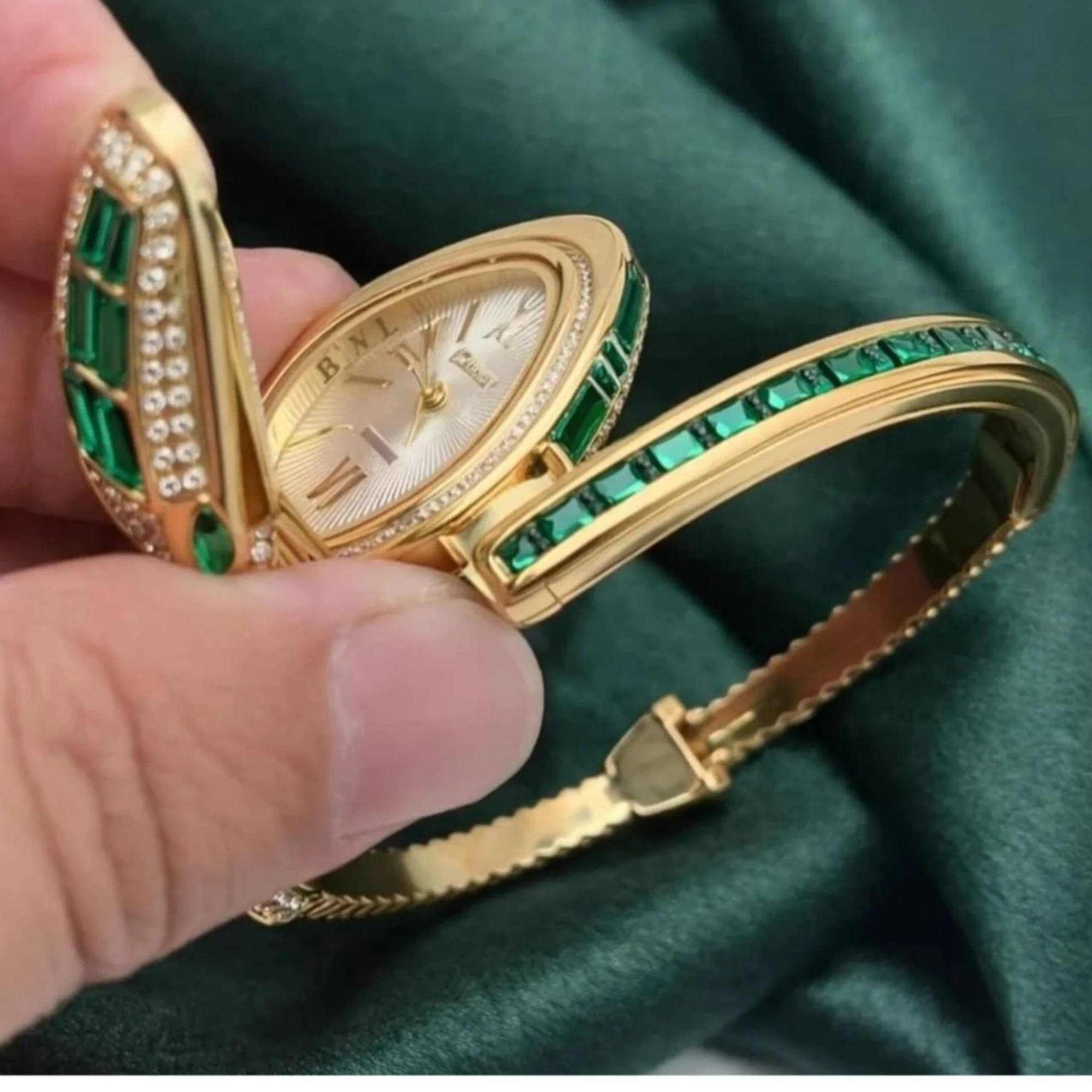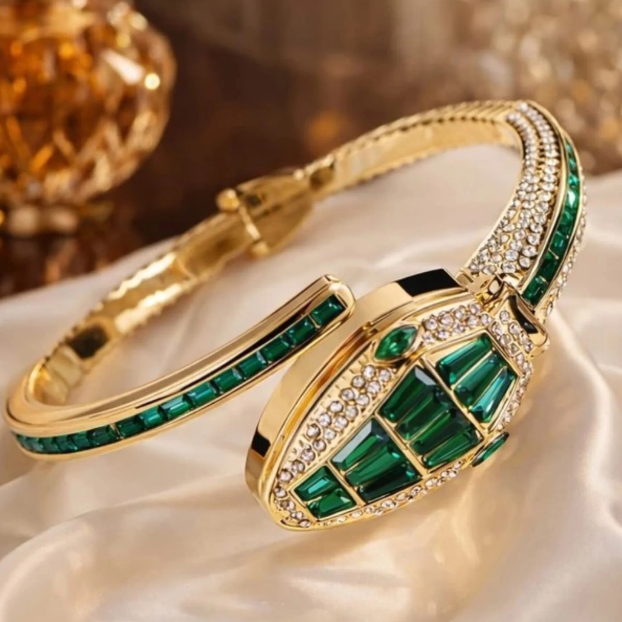 This striking gold-toned bracelet watch features a bold serpent-inspired design adorned with deep emerald-green stones and shimmering crystal accents.