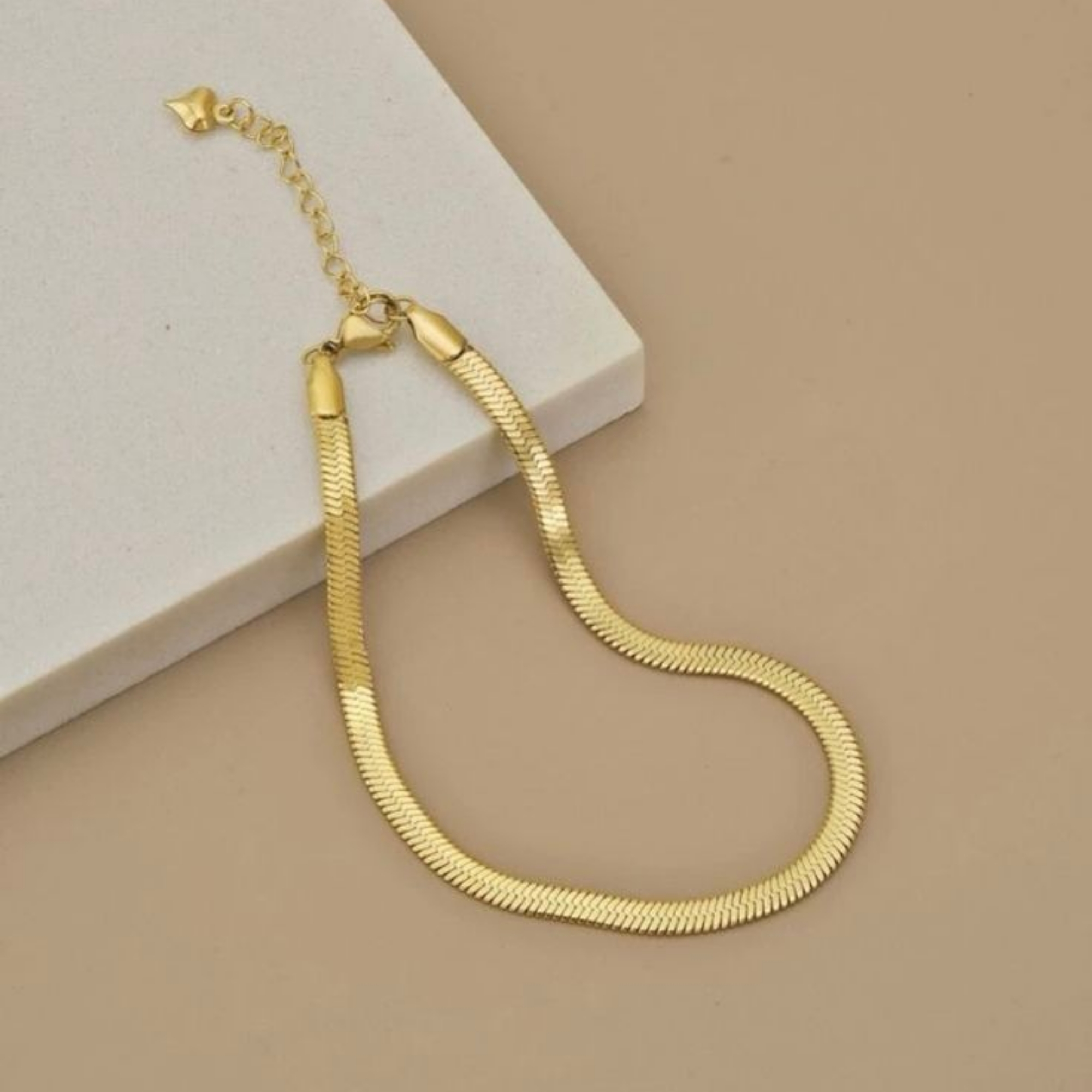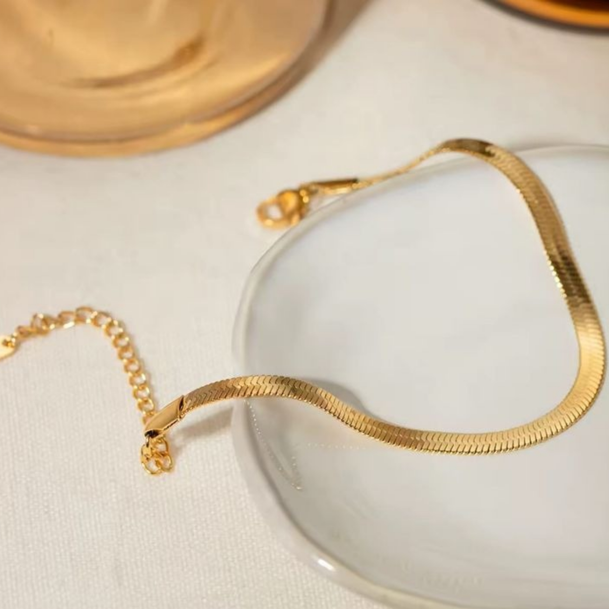 This elegant bracelet features a fluid snake-chain design with a polished gold finish that radiates timeless charm.