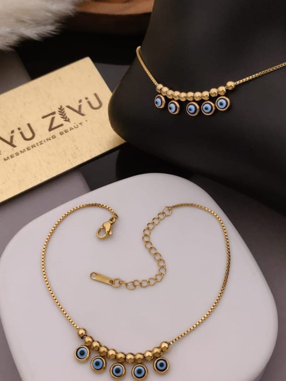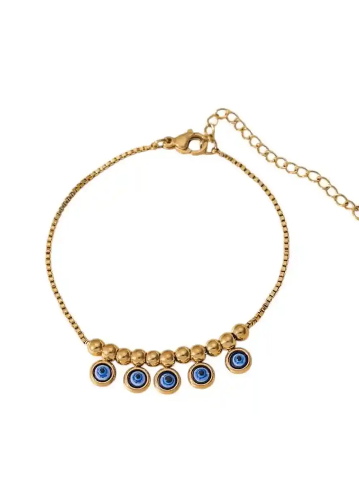 - A stylish gold-toned anklet adorned with classic evil eye charms and delicate beads.