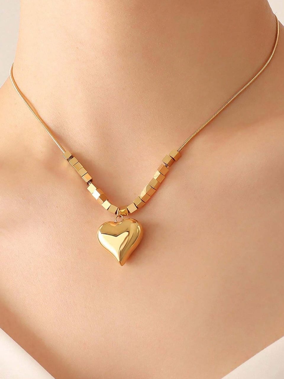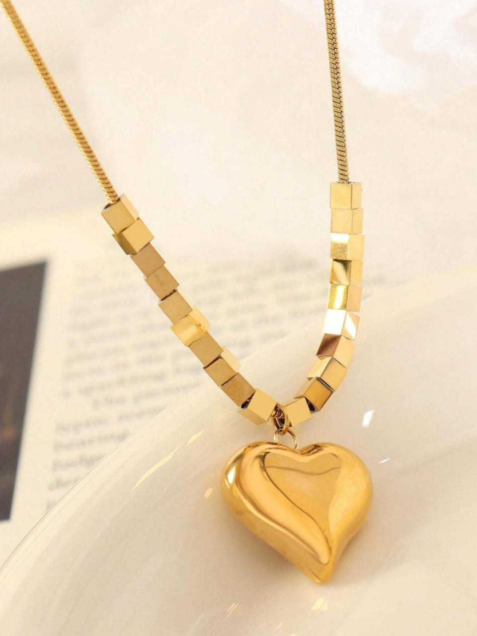 - A timeless fusion of elegance and edge, this necklace features a sleek golden heart pendant framed by modern cube beads.