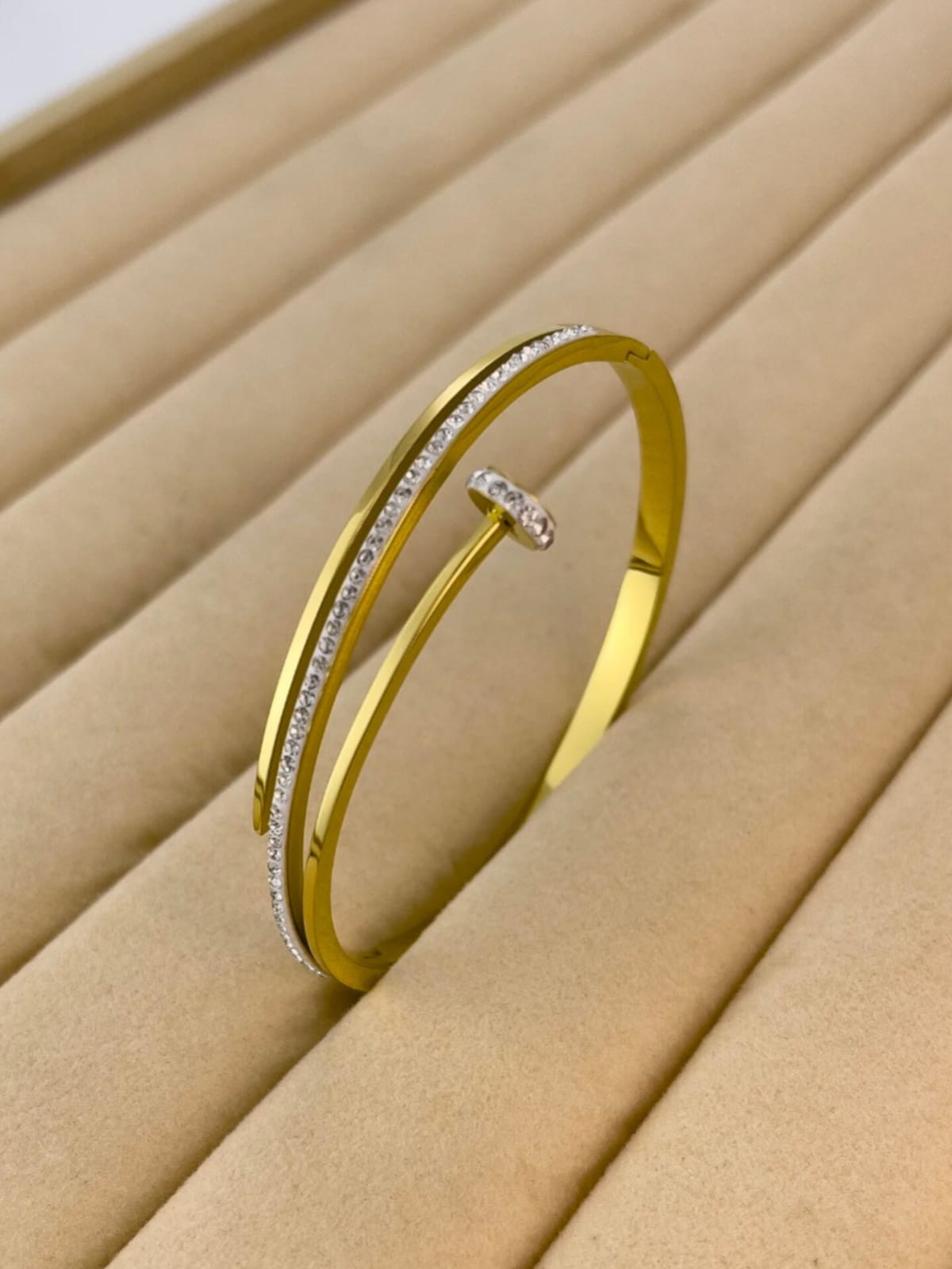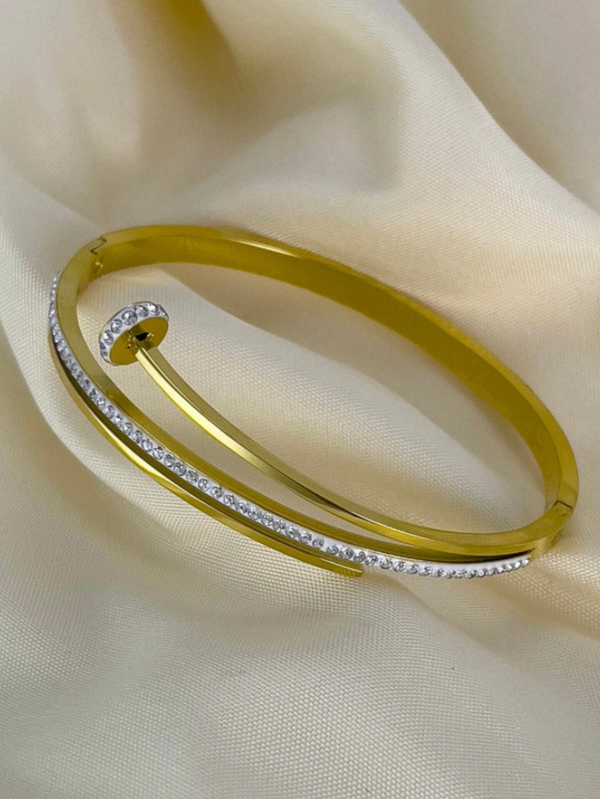 - This minimalist bangle features a bold crossover silhouette inspired by curved hardware, finished in polished gold-tone metal.
