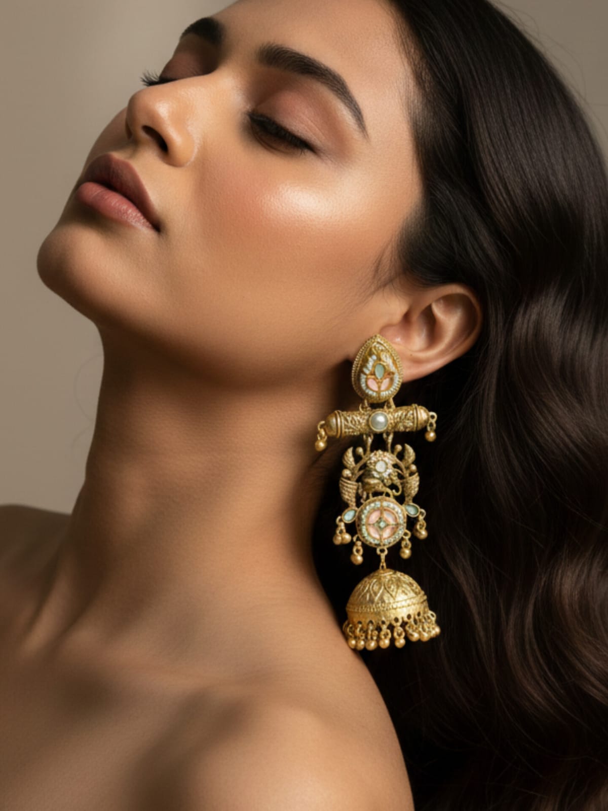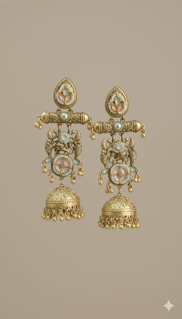 - These majestic tiered Jhumkas are a tribute to traditional Indian royalty, featuring intricate Jadau (minakari) work with delicate pastel-toned enamel accents.